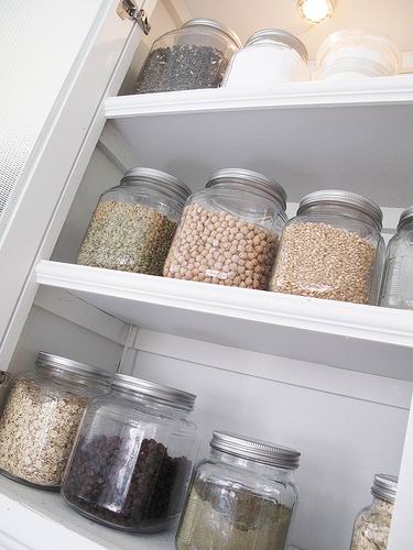 Горошек, фасоль и чечевицу содержите в стекле, если боитесь вредителей. Но не забывайте их время от времени пересыпать, проветривать. Если вы гордитесь стерильной чистотой своей кухни, то для этих продуктов прекрасно подойдут полотняные мешочки.