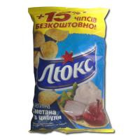 Состав: картофель, масло растительное, ароматизатор идентичный натуральному «сметана и лук»: лук сухой меленный, соль, сахар, маслянка сухая, усилители вкуса и аромата (Е621, Е627, Е631), сухая молочная сыворотка, регуляторы кислотности (молочная кислота, яблочная кислота), дрожжи сухие, гидролизованный растительный белок (соя), петрушка, сухая сметана, натуральные ароматические вещества, порошок чеснока, подсолнечное масло, добавка против слеживания и комкования (Е551), черный перец молотый.