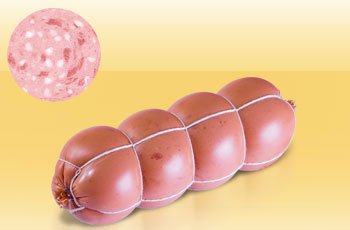Высококачественная, вкусная колбаса. В ее рецептуру входят свинина, говядина, яйца. Красивый срез изделию придают нарезанные некрупными кубиками говядина и шпик.