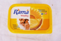 Спред Rama Vitality с комплексом витаминов А, Д, Е и сливками. Состав: масло подсолнечное рафинированное дезодорированное, жир переэтифицированный рафинированный дезодорированный, вода, сливки сухие, пахта сухая, лецитин, соль, кислота лимонная, ароматизаторы масла натуральный и идентичный натуральному, ароматизатор натуральный молочный, витамины А, Д3, Е. Энергетическая ценность 589 ккал. Хранить при Т от 0 до 15'С. Срок хранения 6 месяцев. ТУ 9142-004-00333517-98.